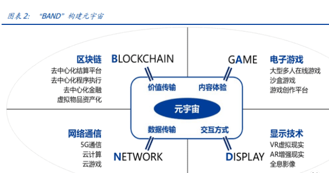 我们最初将构筑元宇宙的技术赛道归纳为“BAND”,即区块链(Blockchain)、游戏 (Game)、网络算力(Network)和展示方式(Display),分别从价值交互、内容承载、数据网络传输及沉浸式展示融合构建元宇宙。